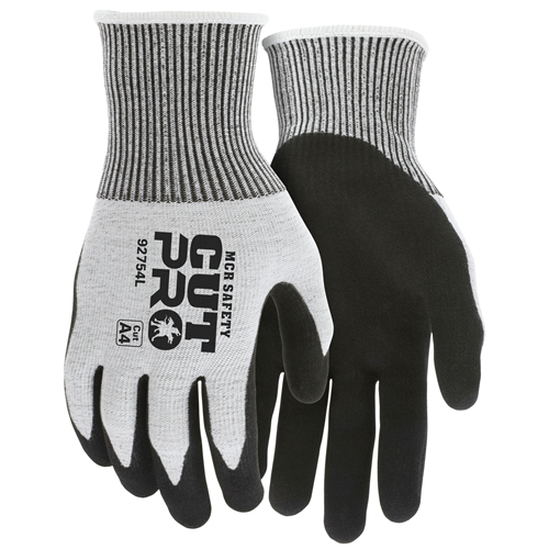 Our top selling MCR Safety Cut Pro gloves are manufactured on seamless knit liners that are flat dipped to reproduce the natural curved shape of the hand. What does this mean for you? You get protection and comfort for heavy duty jobs. The 92754 features soft 13-gauge salt and pepper HyperMax cut resistant shell.  The palm and fingertips are double dipped with rugged nitrile coatings.  The outer coating is made of sandy foam nitrile that absorbs oils and provides outstanding gripping power in oily and wet conditions.  The inner coating is made of a flat nitrile dip and deflects oils and fluids away from the cut resistant shell.  These three layers of protection provide you with one of our best all around work gloves!   If you are looking for the best cut resistant gloves, look no further than MCR Safety's Cut Pro options!