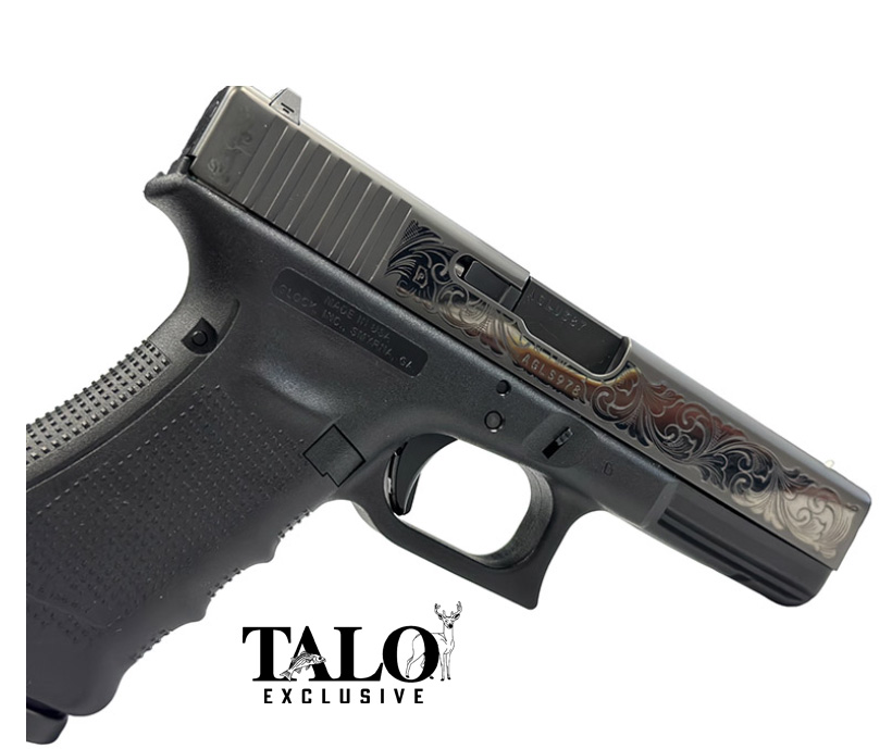 Glock, MFG# 80577, UPC: 196852805778, UOM: Each, Glock 17 Gen 4, 9mm, 4.5" Barrel, Black DLC, Engraved Scrollwork, (3) 17-rd, TALO, GLOC, GLOCHG10, GLOCHGALL, HG10, HGALL