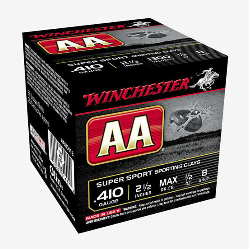Winchester Ammunition, MFG# AASC418VP@, UPC: 020892025738, UOM: CS, AA Sporting Clays VP, 410 gauge, 2.5" 1/5 oz, #8 Shot, 500rds/case, WINC, WINCAM12, WINCAMALL, AM12, AMALL, Case: 1