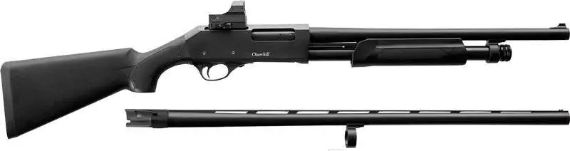 European American Armory Akkar Churchill 612 Combo, Pump, 12 Gauge 3", 18.5" & 28" Barrels, Black, Red Dot Sight, 18.5" Barrel has Ramp Front Sight and Cylinder Fixed Choke, 28" Vent Rib Barrel has Fiber Optic Bead and Improved Cylinder/Modified/Full Chokes, 4 Rounds 111374