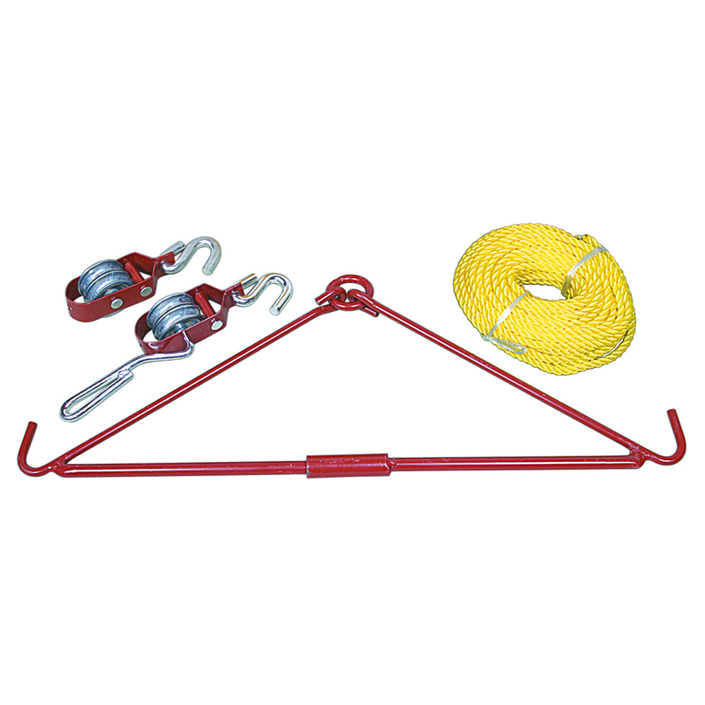 Includes collapsible gambrel for easy storage and cast metal pulleys. Offers an 800 lb. weight capacity.