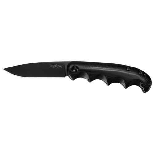 Kershaw Knives - Am-5 Assisted Opening Spear Point Blade Knife with Polished Black Finger Grooved G-10 Front Handle. Model: KS2340X. Assisted opening. 4 1/4 closed. 3 1/4 black oxide coated 8Cr13MoV stainless spear point blade. Pocket clip. Extended tang. Polished black finger grooved G10 front handle with black oxide coated stainless back handle. SpeedSafe assisted opening. Al-Mar knives design. Clam packed.