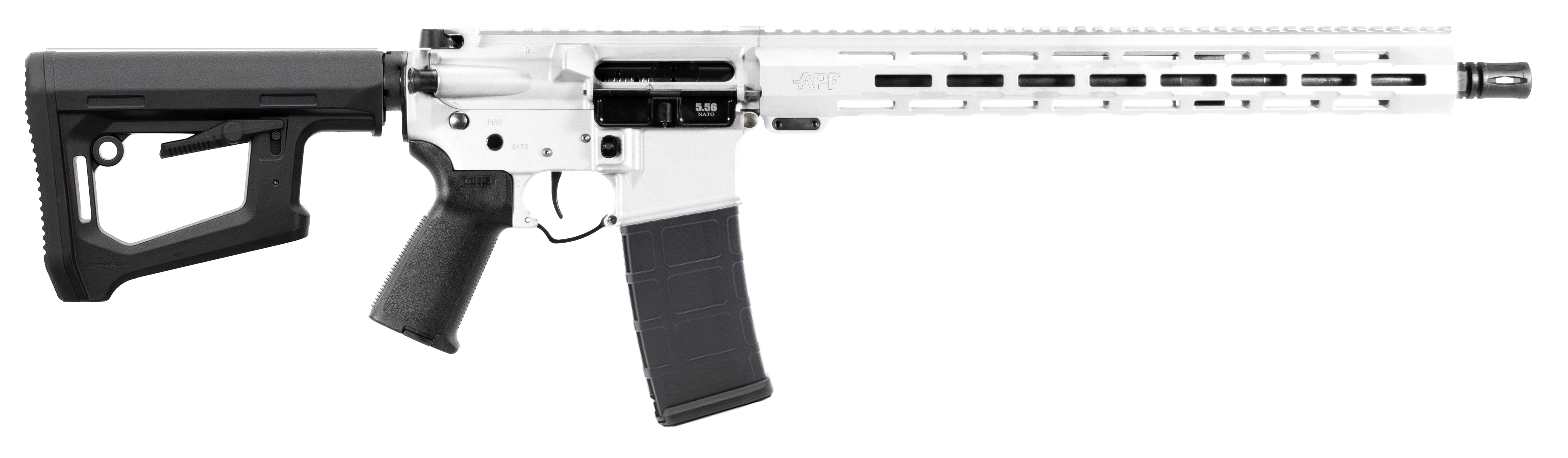 16 4150CM Nitride-Coated Barrel (1:7 Twist) - .750 Mid-Length Gas System - Diamond-Honed Nitride M16 BCG - APF 4.5 lb. Drop-In Trigger - APF Adjustable Gas Block - Magpul MOE PR Stock - Magpul MOE Grip - APF 15 M-Lok Handguard - Forged Receiver - Caliber/ Gauge: 5.56 NATO - Barrel Length: 16 4150CM Nitride- Coated Barrel - Action: Semi-Auto - Front Sight: Rear Sight: None - Color: White - Finish: Cerakote - Material: Aluminum - Hand: Right