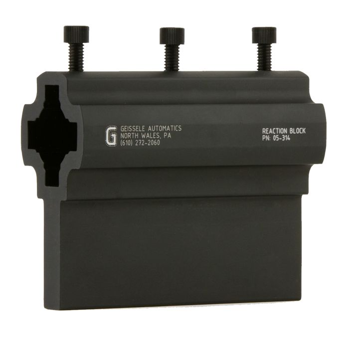 The Geissele Reaction Block is designed to aid in the assembly of lower receivers. Once the armorer has installed the buffer tube, the lower receiver can then be slid into the Reaction Block at the 12, 3, 6 and 9 o'clock positions. This allows the armorer to rotate the lower receiver by 90 degree increments in the block simply by loosening the provided nylon screws, removing the lower receiver and sliding it back in at its desired orientation. The Reaction Block provides an ultra-stable platform for performing an array of lower receiver operations as well as making the installation of the buffer retainer nut quick and easy. This is all possible while keeping both hands of the armorer free to work, saving both time and frustration.