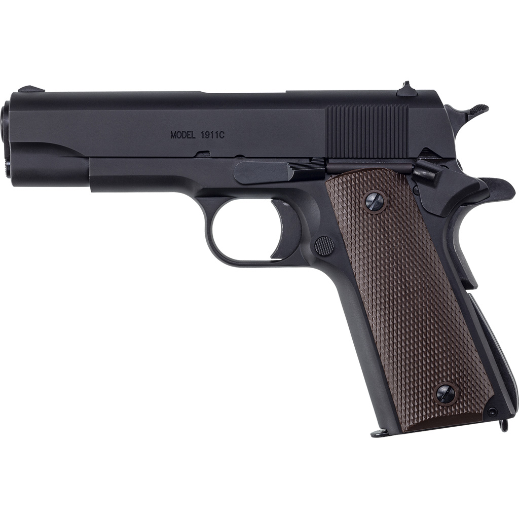The Auto-Ordnance 1911A1 G1 Spec Commander Model pistol is a .45 ACP caliber with a 4.25” barrel and an 8.5” overall length. This pistol features a thumb and grip safety, a firing pin block with a blade front and rear drift adjustable sight for windage. The G1 Spec is designed in a matte black finish with a brown checkered plastic grip. One 7 round magazine is included.