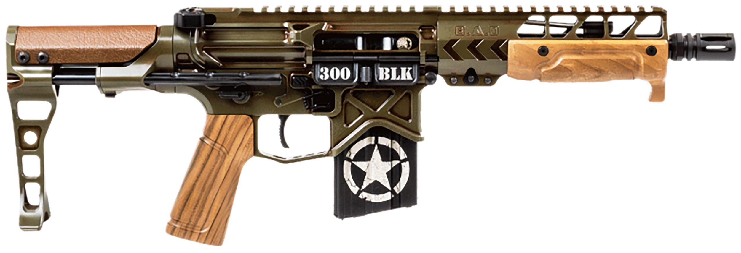 The heart of the Tanker is built on our Billet 7075-T6 Aluminum Lightweight Receiver Set and the VERT Gen2 PDW Stock System. Chambered in .300 Blackout with a 7.50" barrel shrouded in 6.70" WorkHorse M-LOK free float rail system and has an overall length of 25.30". Paying homage to the old-school WWII era weapons, the Tanker is furnished with a custom grade A French Walnut handguard and pistol grip. It is paired with wood finished Kydex cheek rest (UV stabilized) for strength and durability. The complete rifle is finished with an in-house custom blended parkerized green steel and Cosmoline theme finish matching that of the M1 Garand, M1 Carbine, 1903A3, etc. Includes 20rd magazine, SBR hard case and accessories.