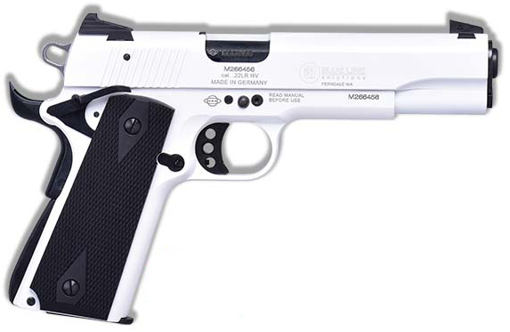 Model: Mauser 1911 - Type: Pistol: Semi-Auto - Caliber: 22LR - Finish: White - Action: Single Action - Grips: Black Grips - Sight: Adjustable Rear Sight - Barrel Length: 5 - Overall Length: 8.5 - Weight: 29.6 oz - Capacity: 10+1 - # of Mags: 1 - Safety: Ambidextrous Safety Magazine Disconnect Safety - Frame: White - Muzzle: Threaded Barrel
