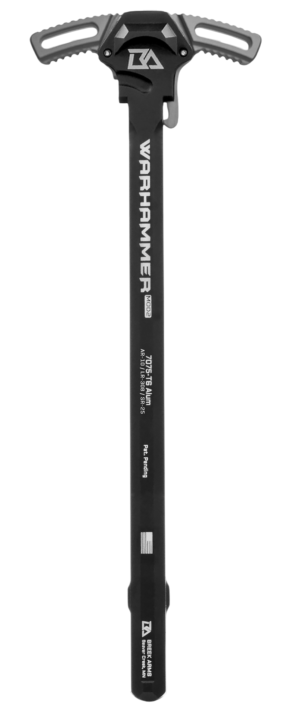 The 308 AR WARHAMMER MOD2 ambidextrous charging handle is an incredibly affordable upgrade compared to other 308 charging handles in the market without sacrificing the quality that Breek Arms is proud of. The Warhammer will substantially increase the use of your .308/7.62 AR as an easy drop in upgrade. Easily grab on either side of the handle and you can quickly charge your rifle even with large gloves with the textured grooves that are cut into the latch handles. The wide set-back latches work great for large optics. The low profile design keeps it slim and sleek looking without sacrificing functionality. Made entirely out of 7075 aluminum for added strength and durability. The new MOD2 design features improvements for further reducing gas blowback in the shooter's face. The relief cuts on the top and bottom of the stem are designed to help direct extra gas out the side and away from your face. And for any gas that does manage to go straight back, we increased the height of the shelf to better cover the back of the upper. These modifications help improve the shooting experience, especially when shooting suppressed. *****COMPATIBLE WITH: Aero M5, DPMS Gen1 High and Low, Knights Armament SR25, STAG-10, Armalite AR10, Daniel Defense DD5 V3, V4, V5, and many others using DPMS Gen1 or Armalite AR10 platform. *****NOT COMPATIBLE WITH: SIG716, Savage MSR10, Smith and Wesson M&P10, DPMS R-25 Gen II, Colt LE901, Bushmaster BAR-10, RRA LAR-8, HK MR762, POF ROGUE AR-10/.308 or others using a DPMS Gen2 style upper.