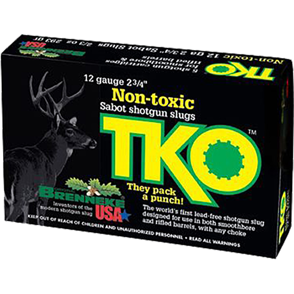 The revolutionary TKO (Tin KnockOut) shotgun sabot is the world's first lead-free slug designed for use in both smoothbore and rifled barrels, using any choke. Brenneke has created a 12 gauge projectile made of tin - yes, tin - that provides outstanding penetration, stopping power, accuracy, velocity and energy (2607 ft/lb at 2001 fps), yet is completely safe for you and other living creatures.