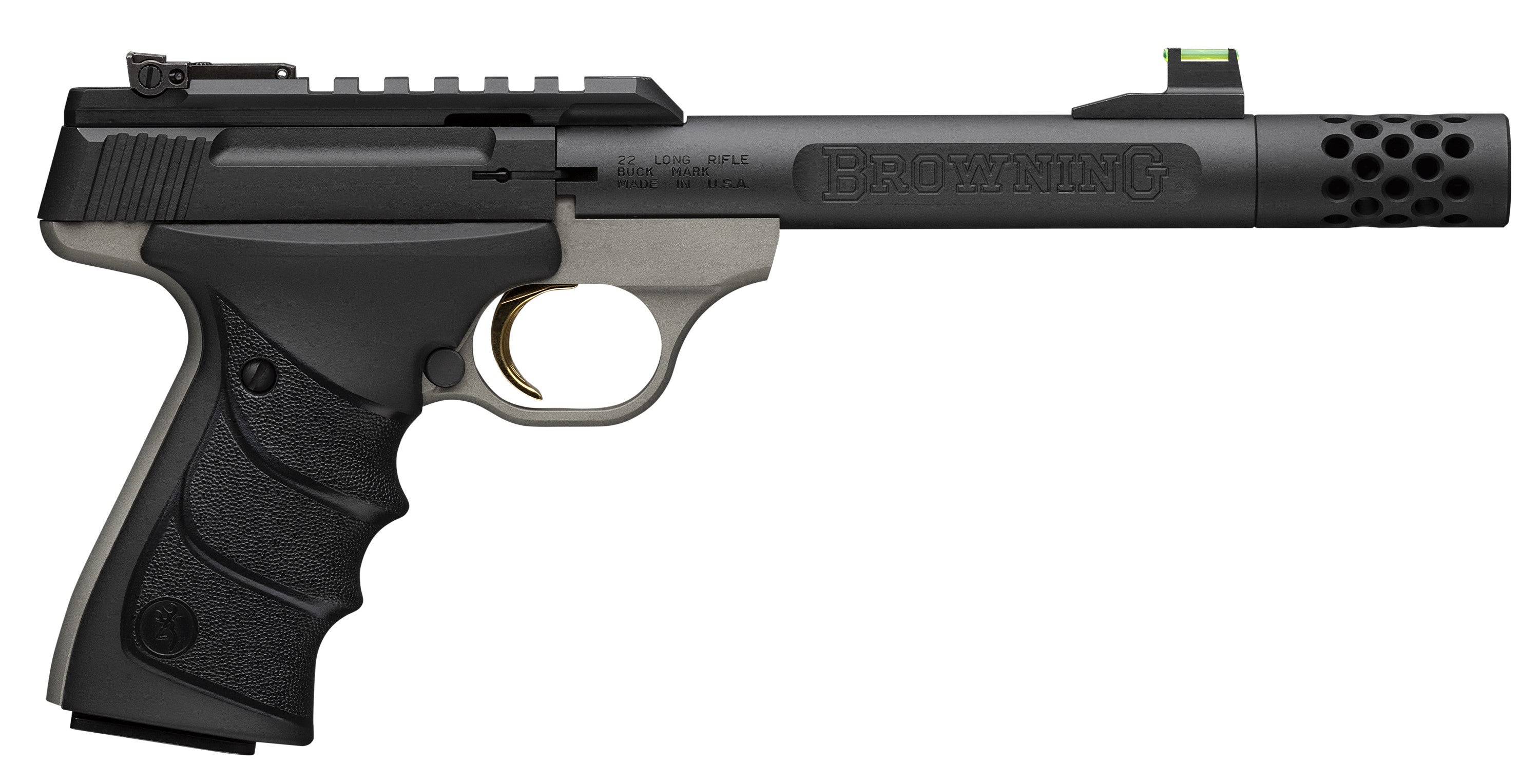 2025 SHOT Show Special- 22 LR semi-automatic pistol with precision machined alloy frame 5.9 matte blued barrel with 1/2-28 suppressor ready threads and muzzle brake soft nitrile rubber Ultragrip RX (URX) grips with finger grooves top Picatinny rail optic base Pro-Target adjustable rear sight and fiber-optic front sight. - Features - 5.9 matte blued barrel with machined Browning logo - Matte gray anodized alloy frame - 1/2-28 SR threads muzzle brake supplied - URX grips with black rubber overmolding - 16-click adjustable Pro-Target rear sight - Green fiber-optic front sight - Picatinny optics rail - Includes pistol rug