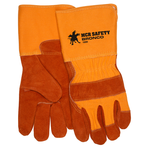 Tough as a buckin' Bronco! These premium russet colored split side leather palm gloves provide strength and durability. Yellow fabric back adds to visibility for safety. The 1690 is made of select A side split leather, has full feature gunn pattern and a 4.5 inch rubberized safety cuff. Don't get bucked by injuries, use the Bronco!