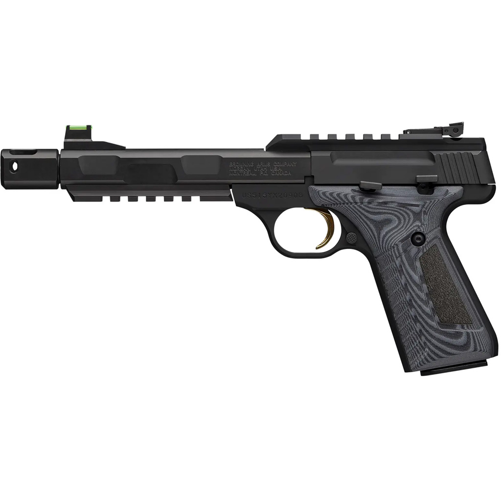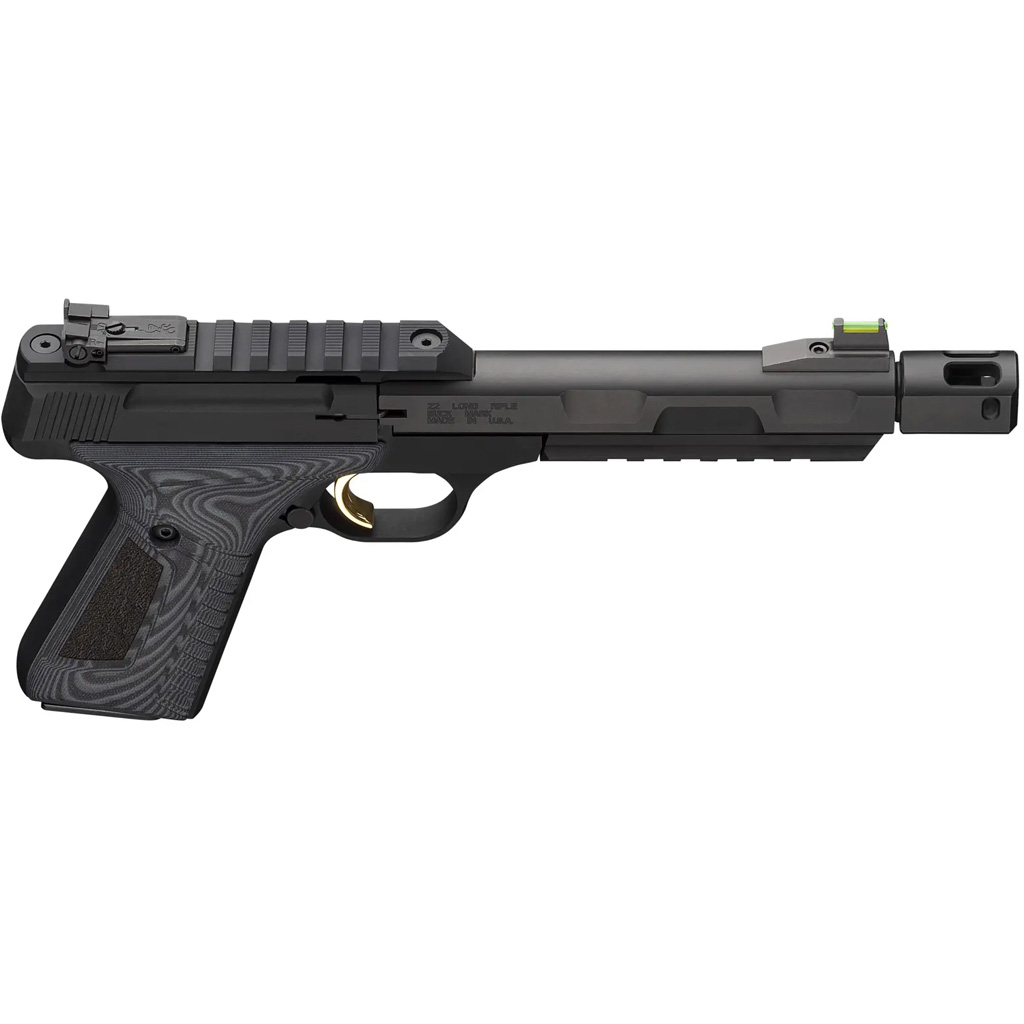 The Browning Buck Mark Contour Pro is a precision-built autoloading rimfire pistol chambered in .22 LR, designed for both competitive shooting and recreational fun. It features a 5.9-inch matte blued steel barrel threaded 1/2x28 and includes a removable compensator to reduce recoil and muzzle rise. Built on a machined aluminum alloy frame, the pistol comes equipped with a Pro-Target adjustable rear sight, a TRUGLO/Marble Arms fiber-optic front sight, and dual Picatinny rails for optics and accessories. Deluxe gray/black G-10 grips offer enhanced handling and style, while the gold-plated trigger adds a premium touch. With a single-stack 10-round magazine and a pistol rug included, the Buck Mark Contour Pro delivers accuracy, balance, and customization in a rugged and elegant package.