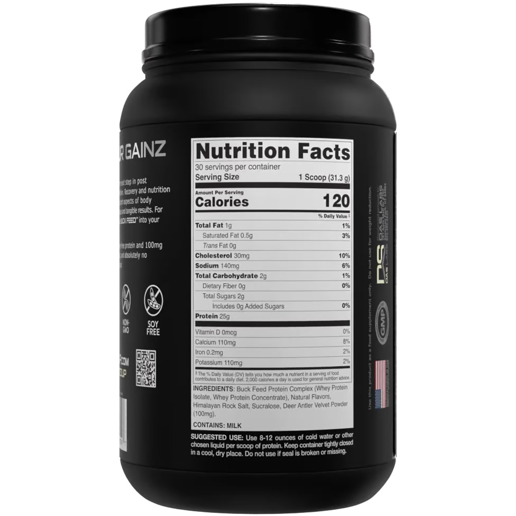 Bucked Up Buck Feed Protein is a high-quality, low-carb whey protein supplement formulated to support muscle growth, recovery, and fat loss. Each serving delivers 25 grams of hormone-free whey protein—primarily from fast-absorbing whey isolate—combined with Deer Antler Velvet Powder for added performance benefits. Designed to be easily mixed and digested, Buck Feed features no hormones, soy, or excess carbs, making it a clean and effective choice for athletes and everyday fitness enthusiasts alike. With a lineup of mouth-watering flavors, this protein offers both exceptional taste and nutritional performance at an accessible price point.