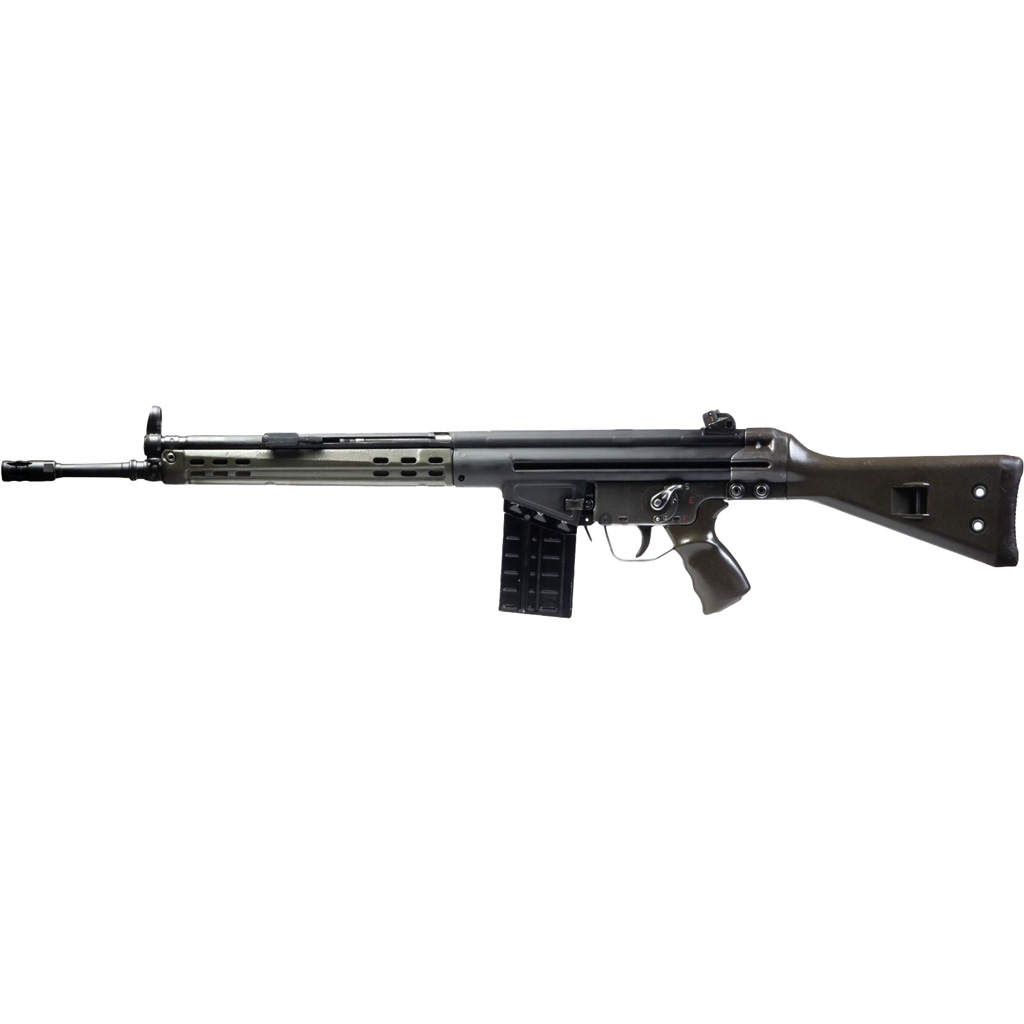 The Century Arms CA-3 Rifle is a meticulously assembled piece of history, blending original H&K G3 parts with new components by PTR Industries. This semi-automatic rifle, chambered in 7.62x51mm (.308 Win), features an 18-inch barrel with a 1:10 twist and a birdcage style flash hider. Utilizing the iconic roller-delayed blowback system, it offers reliability and precision. The CA-3 comes with a distressed black finish, synthetic stock, and includes original battle-worn parts from Portuguese Army service, making it a collector's piece that also provides exceptional performance.
