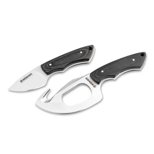 he compact hunting knife set consists of a Skinner knife with integrated gut hook and a Caper knife. Both are equipped with a full tang for maximum stability and a razor-sharp N695 blade. Jimpings on the back of the blade guarantee precise and safe work for processing game, while the striking opening on the blade of the Skinner provides space for up to two fingers and thus enables powerful cuts. Despite their compact dimensions, the hunting knives are comfortable to hold thanks to the ergonomic black Micarta handle scales. Supplied with a high-quality double leather sheath with belt loop. Handmade in the Boker Arbolito knife manufactory in Buenos Aires, Argentina.