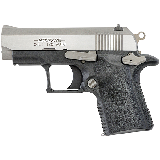 Action: SA - Caliber: .380 ACP - Capacity: 6rd - Barrel: 2.75 - Frame: Polymer Black - Slide: Stainless Steel Matte - Sights: High Profile - Safeties: Ambidextrous Safety Lock - Length: 5.5 - Weight: 11.8 oz - Series 80 - Commander Style Hammer - Solid Aluminum Trigger - Lowered Ejection Port - The new Colt .380 Mustang Pocketlite and Mustang XSP are small lightweight and boast enhanced durability reliability and accuracy making either an ideal handgun for personal protection. The precise machining process use of high quality materials and improvements in design make Colt's new .380 Mustang Pocketlite and Mustang XSP two of the most consistent and reliable firearms on the market. The stainless steel slide and barrel are CNC machined from solid bar stock for precise tolerances. With loaded magazines each of these handguns weighs less than one pound. They both measure 5.5 inches long and have a 2.75-inch barrel. The minimal weight and length of these guns combined with the short single action trigger grip designs frame designs and firing pin safety block make these firearms ideal for personal protection.
