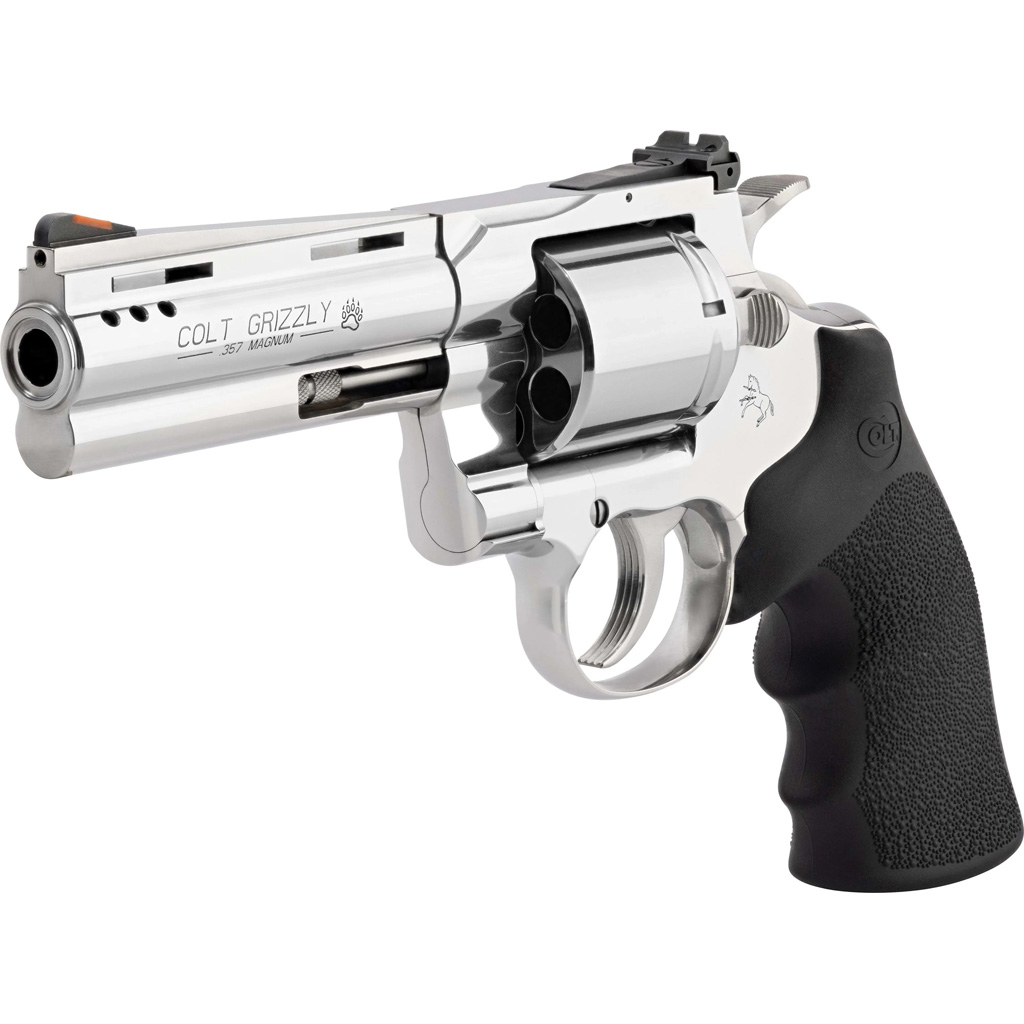 The Colt Grizzly Revolver in .357 Magnum is a rugged and powerful firearm designed for both performance and durability. Featuring a 4.25-inch polished stainless steel barrel with a 1:14 twist rate, this revolver ensures accuracy and stability. Its solid steel frame is complemented by black Hogue grips for a secure and comfortable hold. Equipped with a red ramp front sight and an adjustable rear sight, the Grizzly provides quick target acquisition. The unfluted cylinder enhances strength and reliability, making this revolver an excellent choice for enthusiasts and collectors alike.
