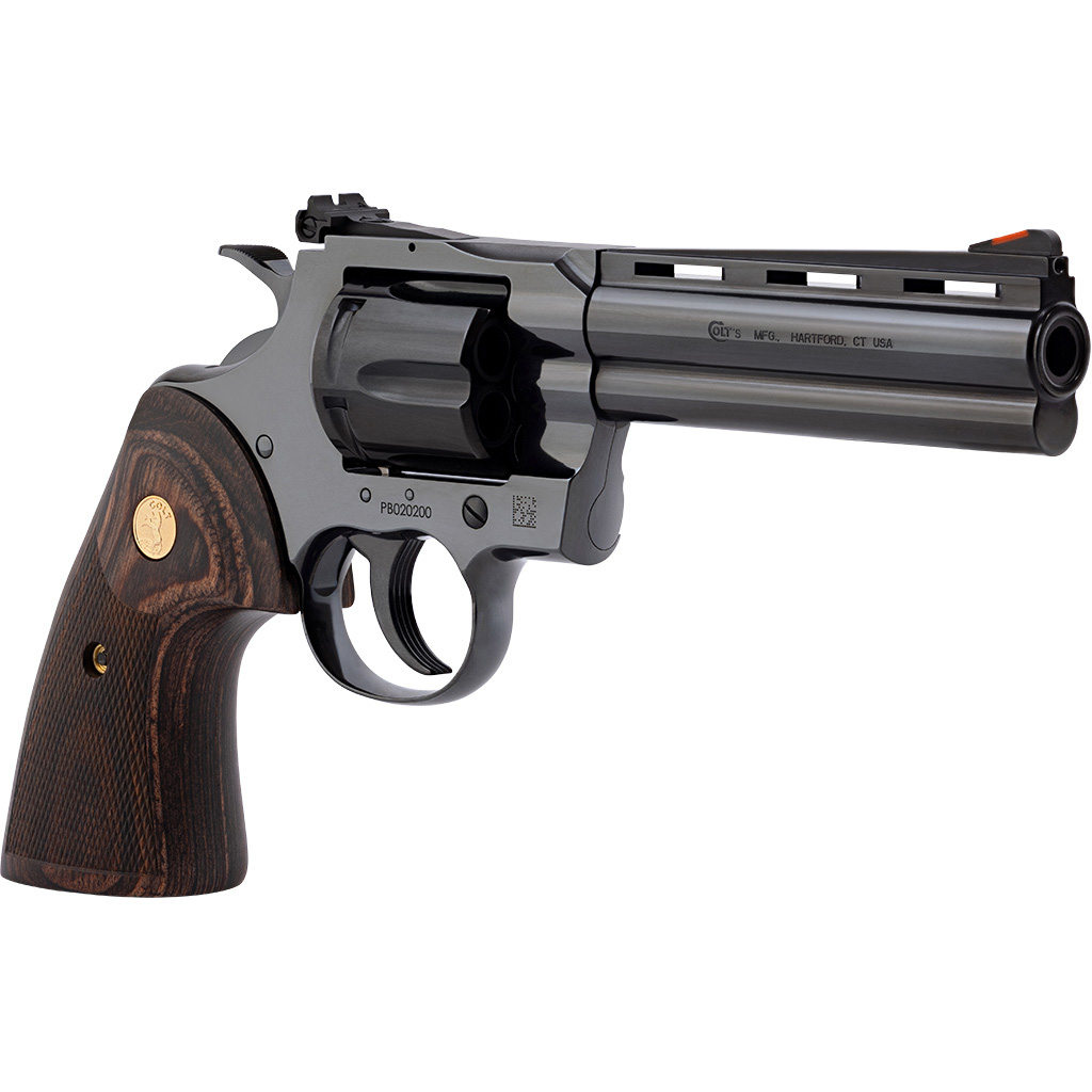 The Colt Python Revolver chambered in .357 Magnum combines precision, performance, and timeless design. This model features a 5-inch barrel with a 1-in-14 rate of twist and a polished blued finish on a durable steel frame. It offers a six-round capacity and operates in both double and single action, making it versatile for a range of shooting styles. Equipped with a red ramp front sight and fully adjustable rear sight, it ensures accurate target acquisition. Weighing 43 oz and measuring 10 inches in overall length, the Python also includes walnut grips for a classic and comfortable feel.