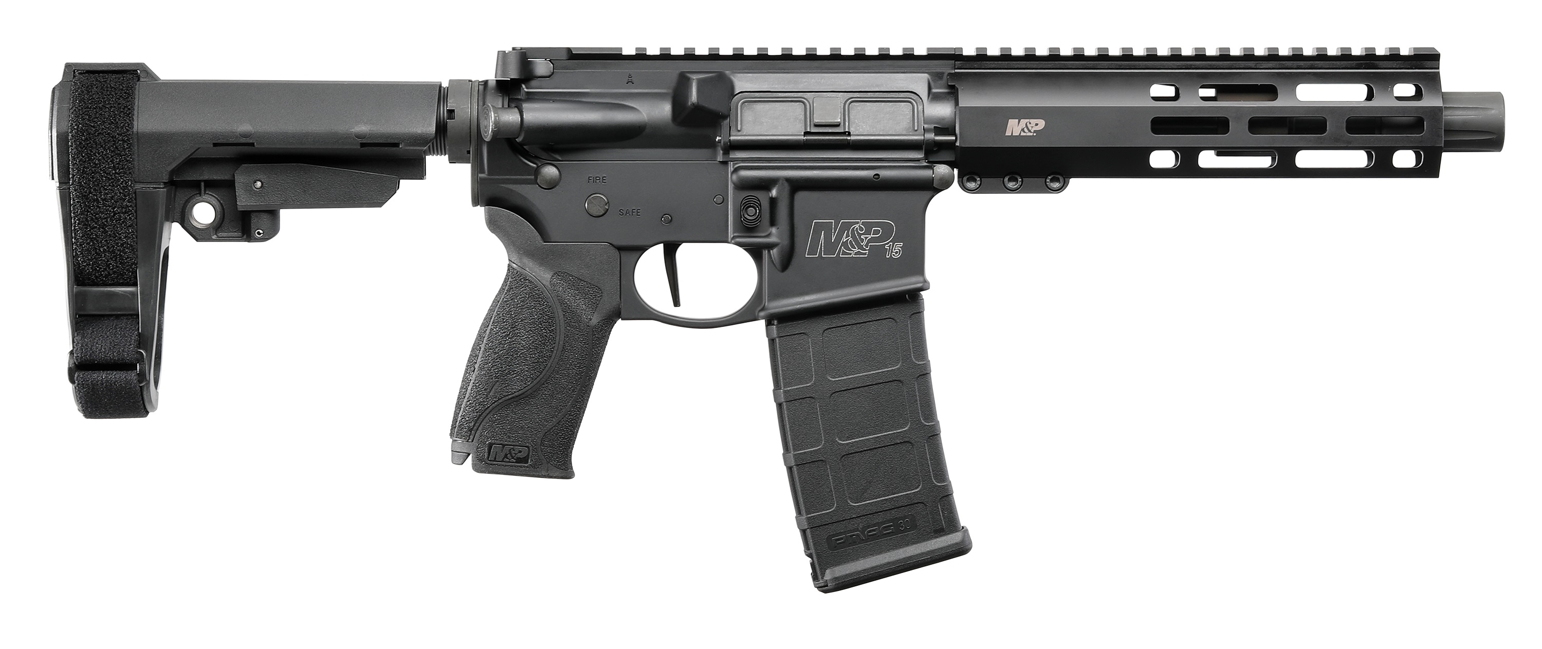 The M&P15 Pistol features a Hodge rail free-float handguard with M-LOK slots, adjustable arm brace, four interchangeable palmswell grip inserts and a full length Picatinny-style rail, one-point QD sling swivel attachment point and a threaded barrel with a blast diverter.