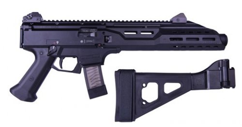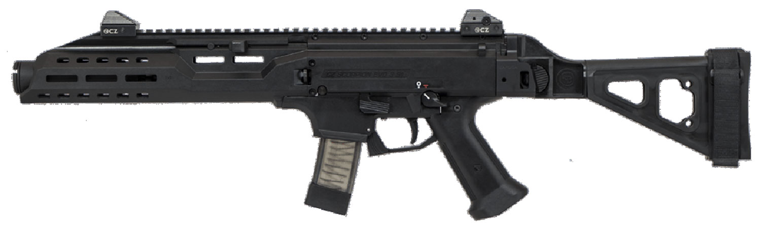 CZ's Scorpion EVO 3 S1 pistol utilizes the carbine-model's extended, slim profile forend that will hide most 9mm and hybrid cans, while offering M-LOK attachment points and boosting the sight radius a good deal. Low-profile aluminum adjustable sights round out the platform, with a rear sight featuring four different aperture sizes, and a top Picatinny rail for mounting optics. The Scorpion line has a fiber-reinforced polymer frame with an ambidextrous safety. The black polymer pistol grip is adjustable for trigger reach. It still uses the 7.72" cold hammer-forged barrel of the standard Scorpion pistol with a muzzle featuring dual threads of 18x1 and 1/2x28 to make fitting a suppressor simple. Note: Current production Scorpion pistols lack the .75" sling slot on the left side of the action that is present on earlier variants. This model features a 5" KAK Flash Can which extends the barrel to just a hair past the forend and a folding brace. It includes a 20-round magazine.