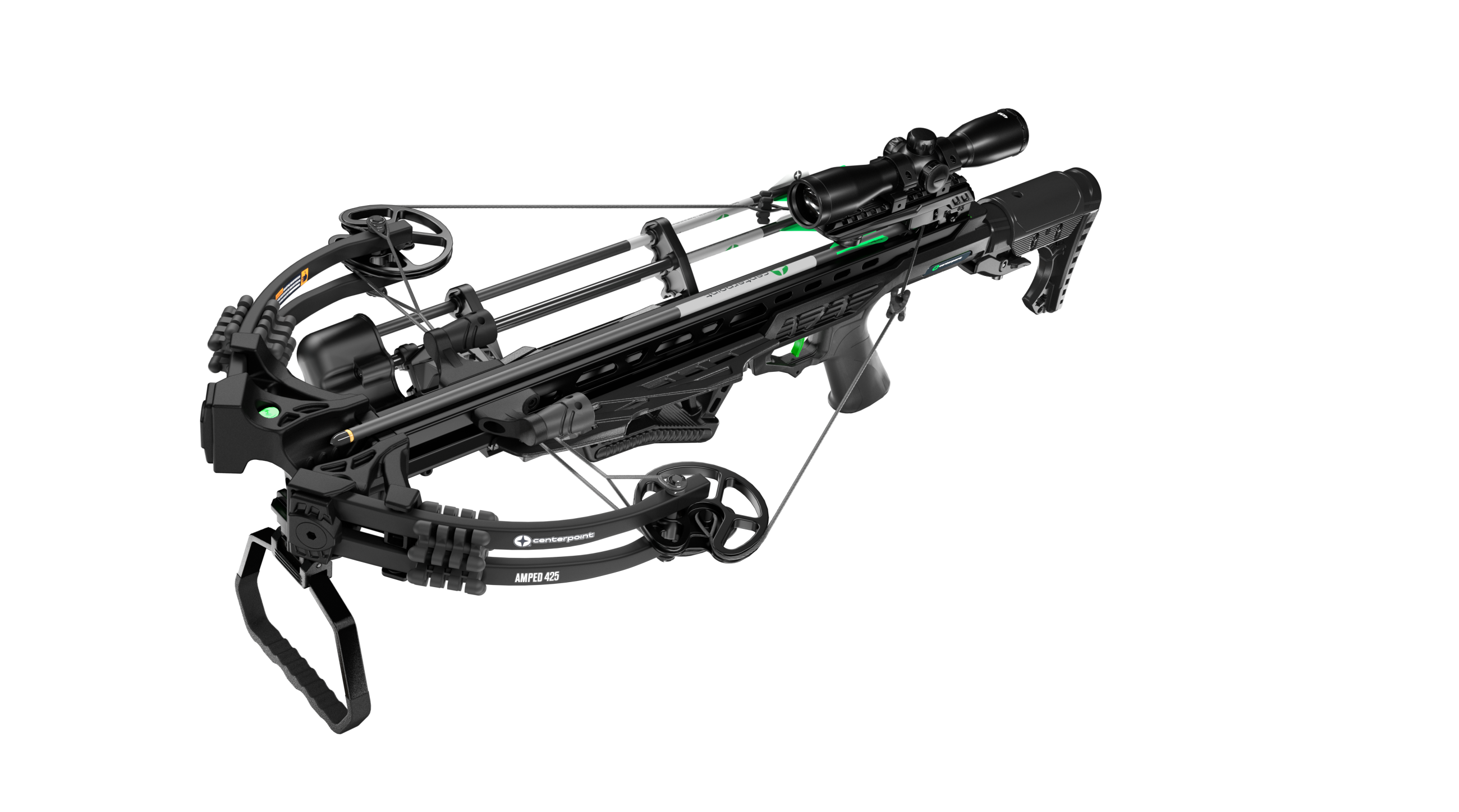 The sleek CenterPoint Amped 425 Crossbow with Silent Crank generates an incredible amount of power while staying compact and maneuverable. Measuring only 12" axle-to-axle when cocked it delivers crushing speeds of up to 425 feet per second and includes features a folding stirrup and silent cranking device for ultra stealth.