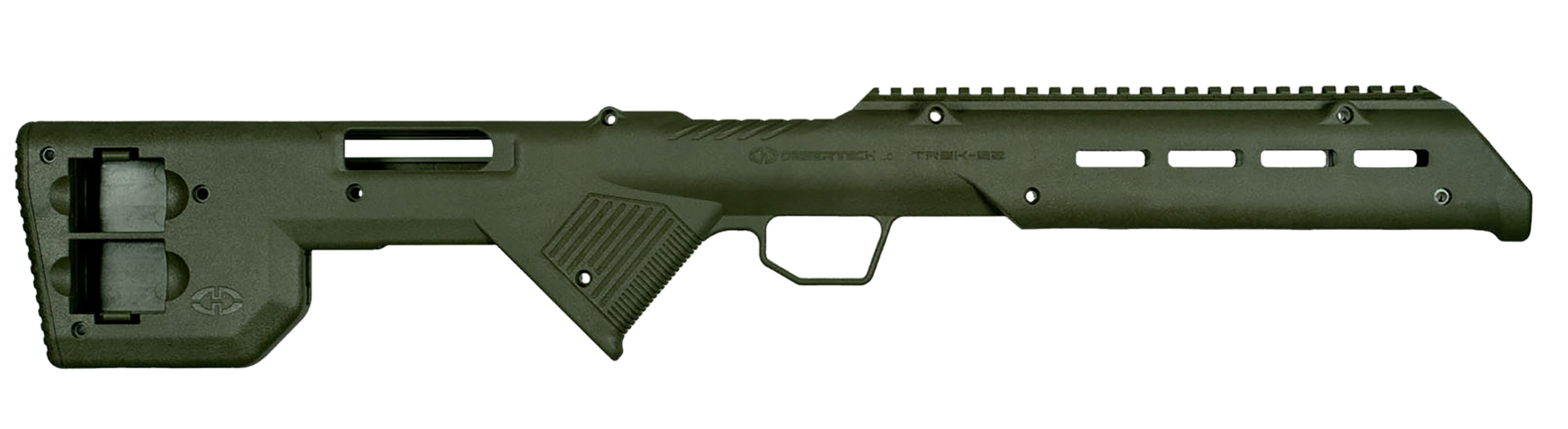 The Trek-22 is 10.25" shorter and 7% lighter than a standard Ruger 10/22 with a wood stock and 18" barrel. With a 10/22 action the Trek-22 makes the ultimate truck gun and goes with you anywhere. The Trek-22 is injection molded using impact resistant glass reinforced polymer for the ultimate lightweight strength. The Trek-22's intergral optics rail allows you to mount any type of optic. The stock has 2 compartments for storing 2 extra 10 rd mags. Straight blade trigger offers a smooth, comfortable pull. Reduced trigger pull from a 6.8lb average to a 4.5 lb average. The 13 M-Lok attachment points located at the 3, 6 and 9 o'clock positions of the handguard gives you the ability to add variety of accessories to your rifle.
