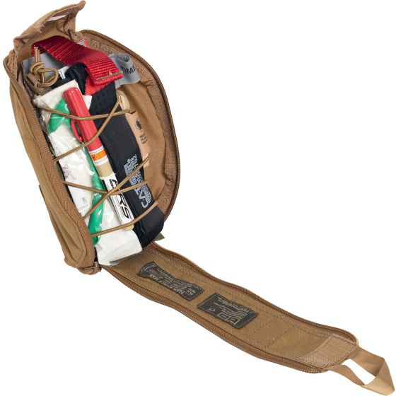 ""One of NAR's smallest IFAKs, complete with essential life-saving equipment for point-of-wounding and self-aid/buddy-aid care to address penetrating, blast or other traumatic injuries. The Eagle IFAK is a compact, versatile individual first aid kit that offers both MOLLE/PALS style connectors to attach to the assault vest/body armor and an upper or lower mounted 2.25"""" belt loop attachment to secure the kit in the high or low position on your duty/pistol belt, all in one carrying platform. Sized as one of the smallest IFAKs in our product line, this innovative kit contains all of the essential equipment for point-of-wounding and self-aid/buddy-aid care to address penetrating, blast or other traumatic injuries. Featuring a Quick Pull Tab, the carrying bag easily opens to reveal the removable kit with just one hand. The kit has a unique, detachable shock-cord inner panel that can be adjusted to carry different components and provides easy access to your IFAK contents by simply pulling the color-coded tab to remove the panel from the carrying bag. The compact size reduces the space requirement needed for an IFAK on your vest or belt.""