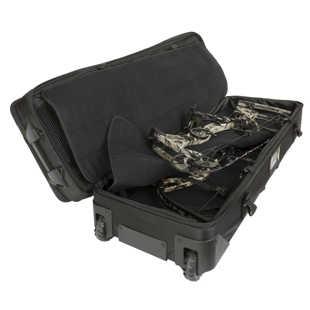 A travel case for protecting archery set-ups while you're soaring to the next big shoot or hunt. The light and sturdy case is equipped for travel with locking zippers, strategic skid plates and smooth-rolling wheels. Five lift points allow for easy maneuverability. While a separate sleeve allows for dual bow capacity.