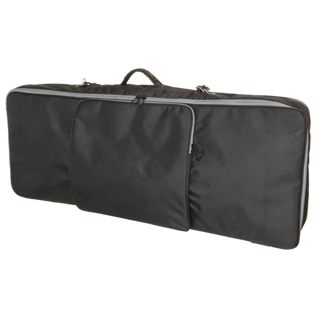 The Elevation Talon 46 double bow case has a split frame design to carry two complete rigs or one full rig and accessories. Each case half is 46" long x 3" deep x 18" tall, with both featuring string and cam cradles and bow tie downs. The front lid has an over-sized arrow pocket, long rod pocket with adjacent accessory pocket and topped off with two side rod pockets. The Elevation handle and shoulder strap make the case portable and once at the range, one 18" x 18" x .5" pocket on the back hold target faces or other accessories.
