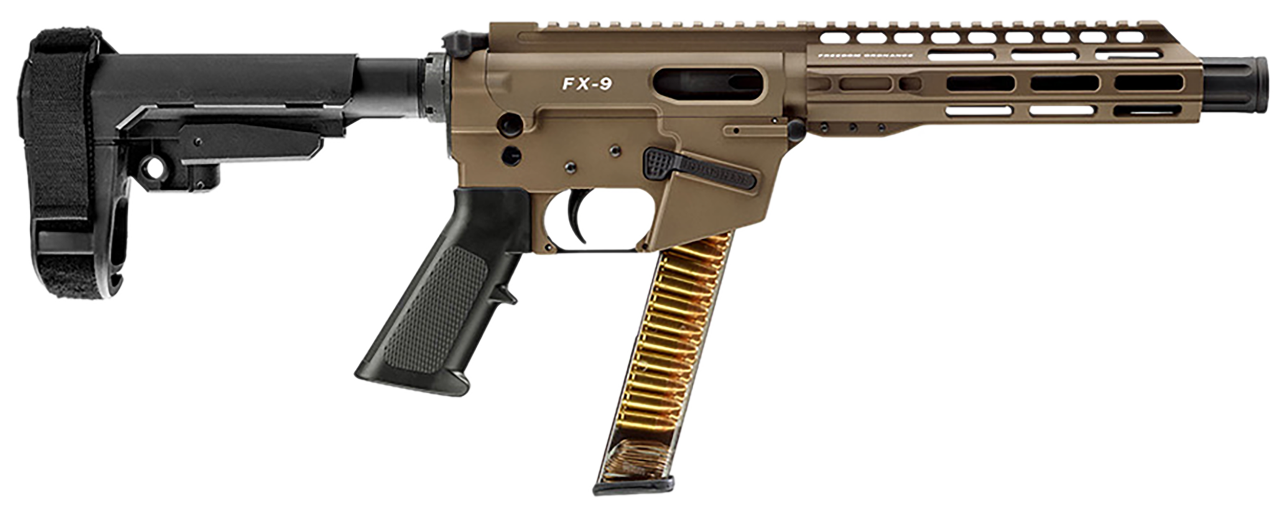 The FX-9 pistol with the SB Tactical SBA3 pistol brace installed from the factory. Equipped with a faux suppressor.
