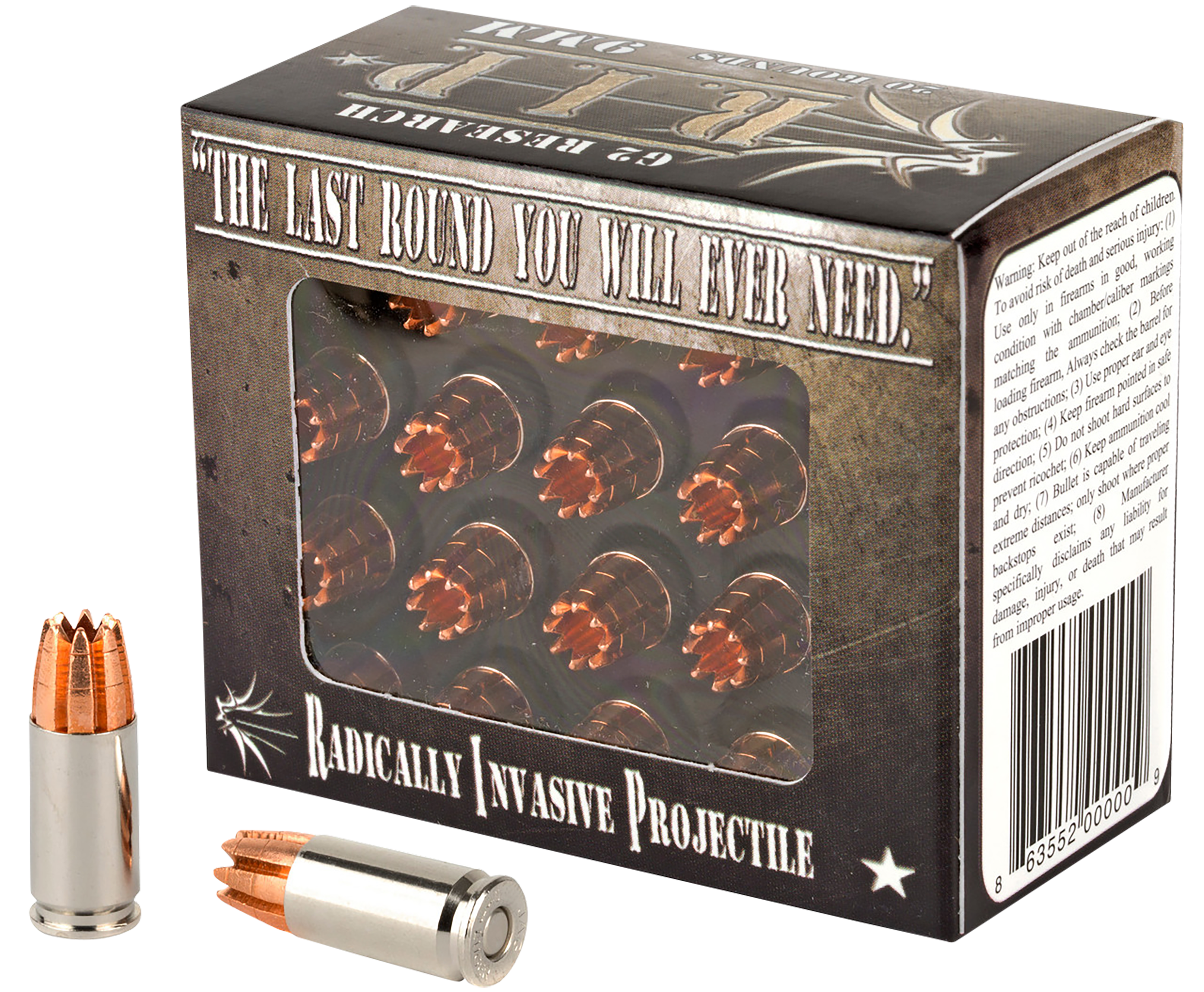 The G2 Research Radically Invasive Projectile (RIP) bullet is a copper hollow-point with the tip of the bullet consisting of eight trocar-shaped petals upon impact, acts similar to a holesaw. RIP bullets act like a FMJ on impact in solid objects and as the bullet passes through soft tissue it expends its energy. The design allows for an ease of entry by reducing the deceleration at the point of impact, causing potential energy to be conserved.