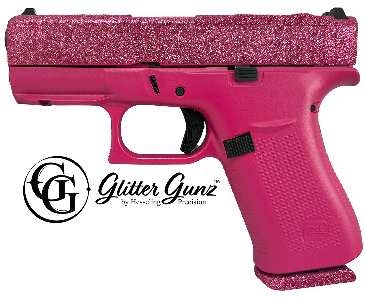 GlitterGunz is a durable sparkling coating applied utilizing specialized equipment and a patent-pending process. The slight tactile texture of the coating provides the user with a non-slip grip making it easier to operate a semiauto handgun's slide.