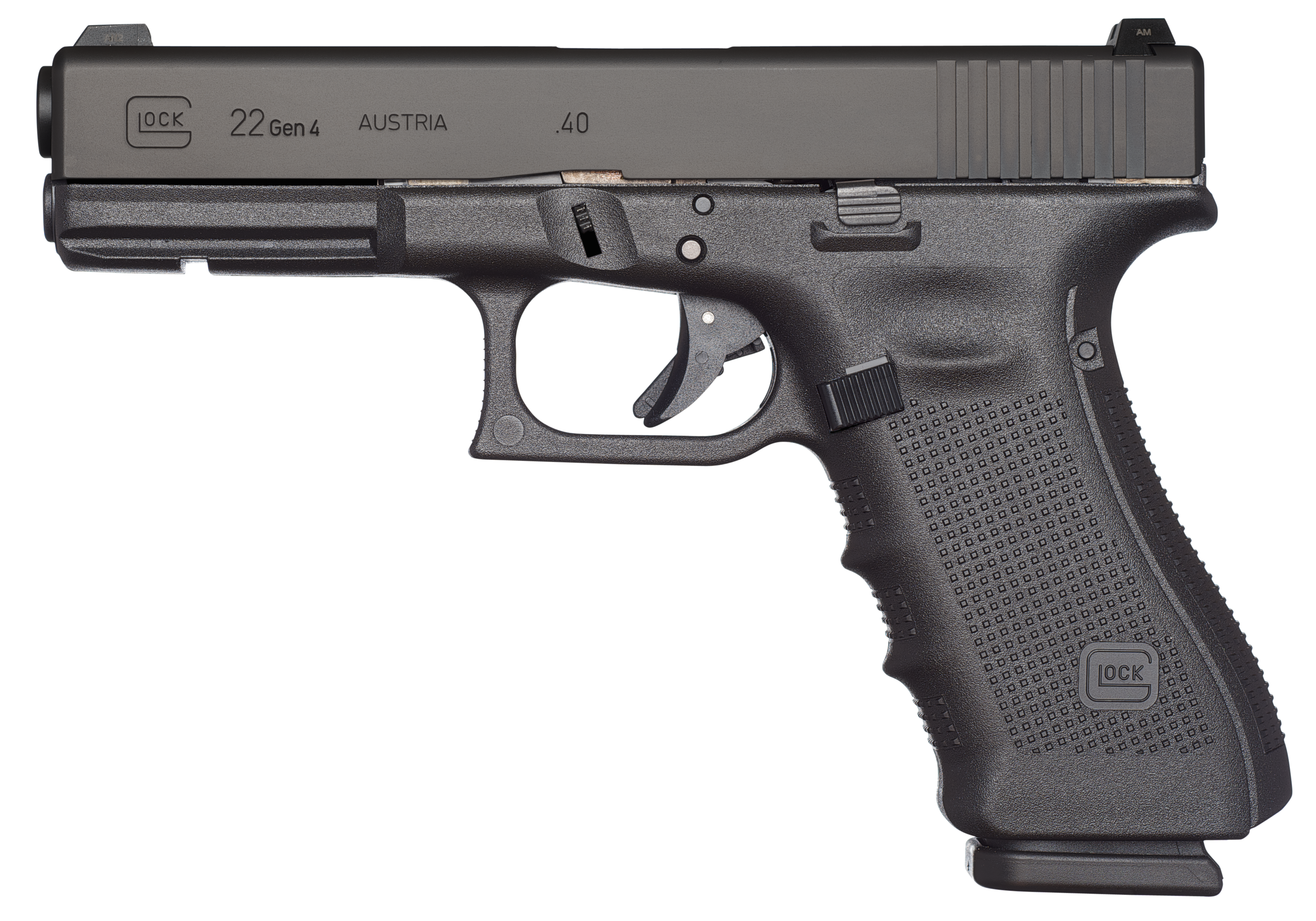This Glock 22 Gen 4 in 40SW introduces revolutionary design changes to this model of perfection that the majority of law enforcement across the country put their trust in every day. Its modular back strap design lets you instantly customize the grip to adapt to an individual shooter's hand size. The frame employs the scientifically designed real-world-tested Gen 4 rough textured technology. Internally the dual recoil spring assembly substantially increases the life of the system. A reversible enlarged magazine catch changeable in seconds accommodates left- or right-handed operators.This G22 Gen4 model has a black frame with black slide fixed sights and 15-round capacity.