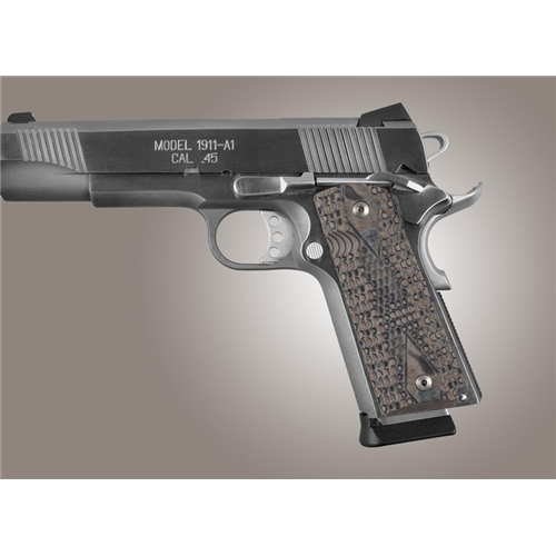 Hogue Extreme G-10 grips are made from high strength G-10 composite. The materials used in the production of the Extreme Series G-10 Grip make for a first class product that is both strong and durable. The Extreme Series Grips are unique in that they are very thin; the lower profile presents the shooter with a comfortable and controllable grip. Extreme grips combine fit, form and function into a single product for the shooter looking for the ultimate shooting experience. Specifications: - Fits: Govt. Model S&A Mag Well - Style: Piranha Grip G-10, G-Mascus - Color: Black/Gray.