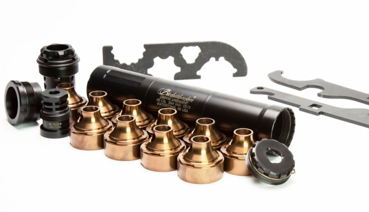 ALL NFA RULES APPLY. Costly R&D resources were spent to develop the patent pending ECO-FLOW baffle technology for the Bushwhacker 46. This baffle system provides reduced back pressure, greater structural strength, higher heat resistance for enhanced durability, and longer service life, as well as 5-7db sound pressure level drops vs the original version. This high performance baffle technology allowed engineering to reduce the overall length of the product to a compact 7.75" while simultaneously increasing performance. These are typically inversely related variables in the world of suppressor R&D. The Bushwhacker retains the patented Ratchet-LOK end cap system, which allows users to fully take apart, clean, and maintain their suppressor. Carbon and copper deposits parasitically reduce volume inside suppressors over time, which reduces their sound performance. The Ratchet-LOK end cap system ensures that your Bushwhacker 46 can be cleaned years after ownership, which resets your suppressor to factory weight and sound performance specifications. The PLAN-A taper mount interface, provides an accurate, minimal length and weight solution to configuring the suppressor in a rifle configuration. This configuration supports Griffin's tried and true taper mount devices, which have been proven to provide the least point of impact shift and greatest accuracy to long range shooters in the firearms community. This configuration weighs a mere 15.8oz ensuring that hunters can practically field the suppressor all day without undue discomfort. The booster piston system affords the user the ability to convert the suppressor for use on browning style action (tilt barrel) pistols. This system accommodates the separately available 3 Lug QD universal piston system which provides a rapid, secure attachment to the host pistol. No longer do users need to worry about their pistol suppressors loosening during use (as with traditional fixed threaded pistons). The universal QD piston system features a taper lock which provides secure attachment. The piston can be attached / detached in any one of 3 positions, ensuring there are no false positive positions to slow down deployment of the suppressor onto the host firearm. Additionally the manufacturing accuracy of the interface is held to the companies high quality standards for concentrically and blueprint tolerances, ensuring that each mounting position has the same POI shift influence, which is negligible and imperceptible in controlled environment testing. The Low profile 3 Lug interface and associated adapters, provide rapid and secure attachment for fixed barrel firearms. Sub machine guns, lever guns, and the like benefit from this systems rapid and easy attachment. This system adds minimal length and weight and is a staple mounting system in the Griffin line. The A2 1.375x24 mount allows the interfacing of the Bushwhacker 46 to prevalent mil-spec A2 compensators which are typically seen on AR15 class firearms. This interface will also fit Griffin Gate-LOK devices, the higher quality counterpart to the A2 birdcage. The .46 caliber diameter provides end users with the most caliber flexibility possible, while retaining quality sound suppression. .450 Bushmaster, .458 socom, .45-70 Govt, and other large bore calibers are at home with the Bushwhacker 46. The .30 caliber Paladin blast shield front cap can be interfaced with the Bushwhacker 46 further improving sound performance on the Paladin with 30 caliber and lesser rounds like .308 Win, .300 BLK, and 6.5 Creedmoor. Bushwhacker 46 Manual Features : Patented Ratchet-LOK end cap system for user serviceability and end cap diameter optimization. Patented ECO-FLOW baffles, for reduced back-pressure and increased performance. Compatible with Griffin Taper Mount minimalist devices, TM Hammer Comp, and others with included Plan-A , and all Griffin Taper Mounts with the Plan-A XL Compatible with Universal QD piston system 1.375x24 threaded rear interface to support alternative mounting options Supports 3-lug QD kit in 9mm and 10mm/.45 via 1.375x24 Booster piston housing Supports rifle calibers from .22 up to 45-70 Govt. Supports Pistol calibers up to .45 ACP Use of 30 cal Paladin blast shield end cap increases sound performance on 30 caliber and lesser. Specs : 7.75 long x 1.5 diameter 17-4 Stainless Steel tube body and front cap, Black nitride finish 17-4 H900 heat treated stainless steel baffles 15.8 oz in the Taper Mount configuration (using the included PLAN-A ) 17.6 oz in the Pistol configuration (with universal piston system installed) Barrel Length Ratings: 16 -.45-70, .450 Bushmaster, .458 SOCOM 9.5 -5.56 6 .300BLK 8 6.8 SPC, 7.62x39 12.5 .308Win 20 .300WM 24" .300RUM/.338LM What's Included : Bushwhacker 46 tube body Patented ECO-FLOW baffle system Patented .46 cal Ratchet-LOK end cap PLAN-A Taper Mount interface EZ-Brake Muzzle brake, .30 CAL - 5/8x24 threaded Booster piston housing (1.375x24) Booster piston retainer Booster piston spring Bushwhacker wrenches (2) Griffin multi-function wrench suppressor pouch