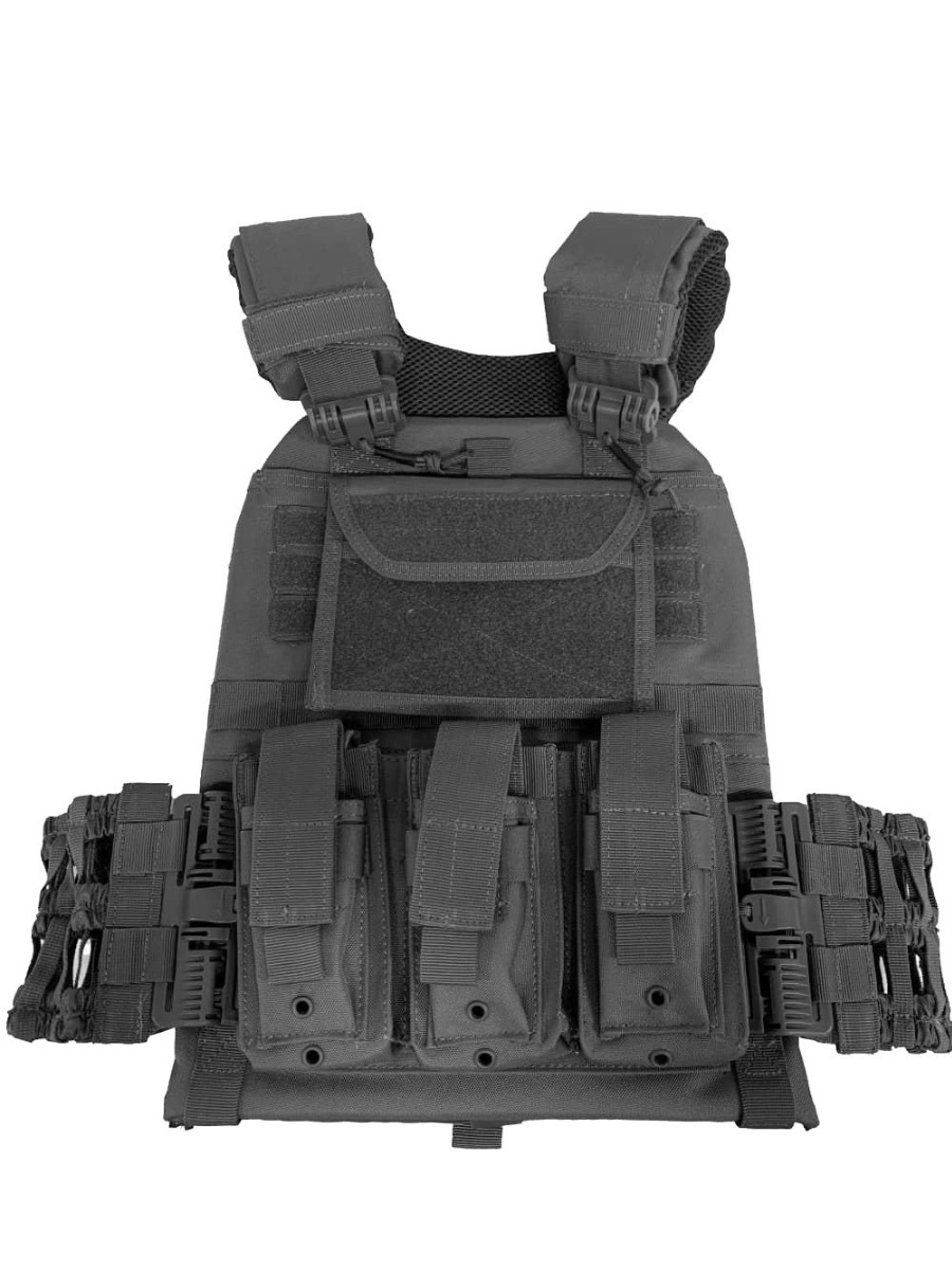 Guard Dog Body Armor s DANE-BLK plate carrier is a durable 600D Oxford carrier designed for multi-use. Fitting 10 x12 plates in the front and back, it also allows the user to have 6 x6 or 6 x8 side plates on either side of the waistband. Thick shoulder and back pads help disperse weight, while MOLLE covers the front, back, and sides offering additional attachment areas. The front of the carrier has dual triple magazine pouches, 3 for AR15 magazines, and 3 for handgun magazines. The front also comes with an admin pouch attached via MOLLE, and moveable. Quick detach Swift hooks on the waistbands and on the shoulder straps allow for quick removal. Comes with a medical pouch on the back. Color is Black.