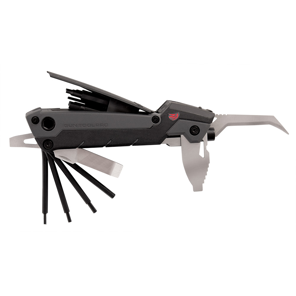 Made for rifles and shotguns, Gun Tool Pros rock-solid frame features 30 hard-working tools. Two-inch long bits fit into the magnetic 1/4³ driver and 1/4³ wrench for extra torque. It features two files, a locking claw-point knife and a removable magnetic storage container for holding small screws and pins. It also features a universal choke wrench and tap hammer, all in a sleek tactical design. Gun Tool Pro sets the standard for compact gun tools.