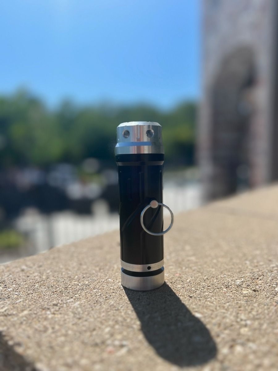 Introducing the "Bang Saber", a civilian legal "flash bang" manufactured for Tactical Shit by Helius Engineering, for training,"distracting",or just for fun. This works just as good as our original device, but now lighter, slimmer, version. Remember, ounces equal pounds, & pounds equal pain! These USA made distraction devices are absolutely amazing! Simply load a 12ga or 9mm blank or 209 primer into the body, remove the pin, and toss. Depending on the blank used, expect a bright flash, smoke, and approx 120-160db "bang" report once the device is tossed.