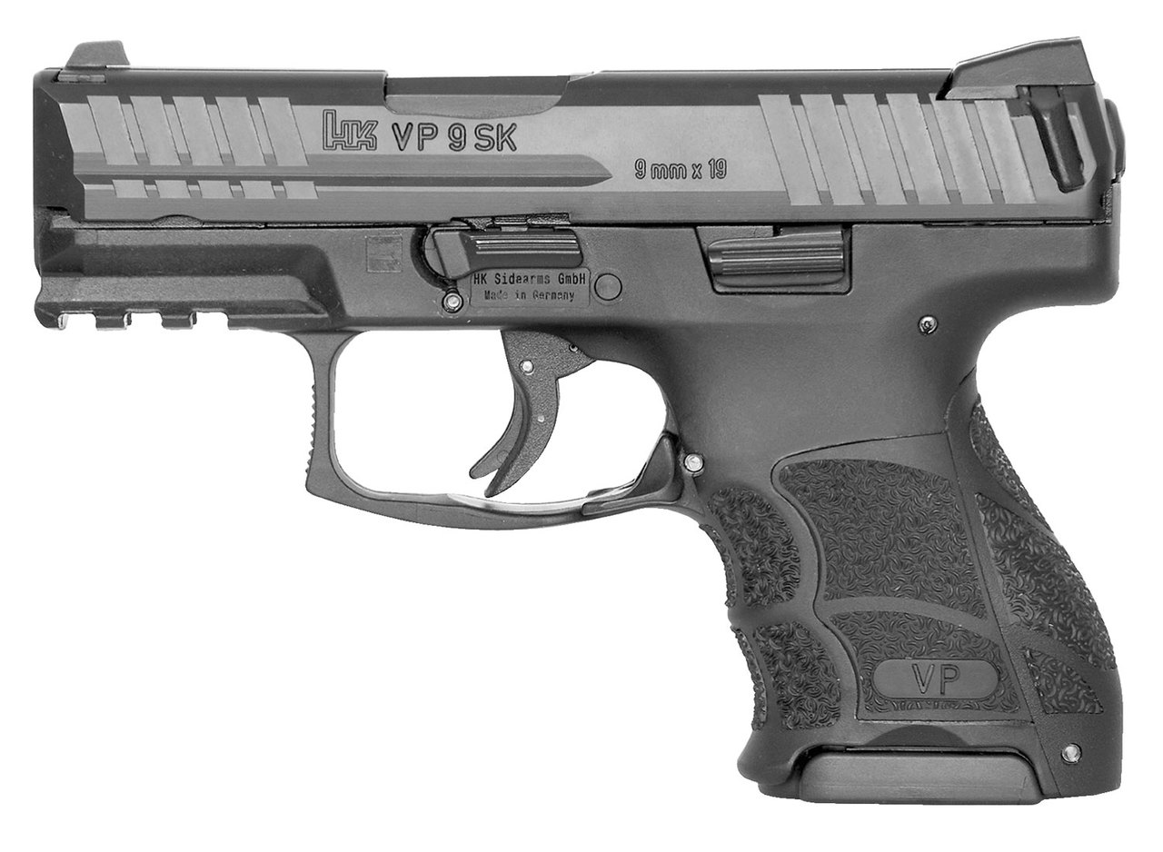 The VP Series is Heckler & Koch's first striker-fired HK since the P7 series pistols introduced in the 1980s. It is well-suited for civilian sport shooting security military and law enforcement use. The VP Series integrates a striker firing system with an enhanced HK light pull trigger. HK's cold hammer-forged barrel made from cannon grade steel ensures long service life as does the polygonal bore profile which also provides a slight increase in muzzle velocity. Slide releases are present on both sides of the frame and the paddle-style magazine release can be easily activated by left- or right-handed shooters. A unique VP feature is HK's patented rear-mounted charging supports on each side of the slide provide better gripping leverage for racking the slide rearward. The machined steel slide is protected from corrosion and wear by HK's hostile environment finish and all metal components including springs and pins have superior metallurgy. VP SK subcompact models feature a more concealable design with a shorter barrel abbreviated Picatinny MIL-STD-1913 rail and a compact grip frame which retains the adjustable VP grip feature of interchangeable backstraps and lateral grip panels.This model comes equipped with 3-Dot sights and includes one flat base and one extended floorplate 10-round magazine.
