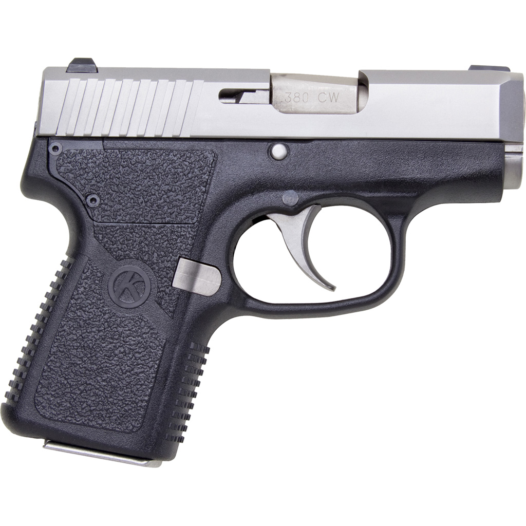 The Kahr CW380 Pistol structures a black polymer frame with a matte stainless slide and a textured polymer grip. The magazine holds a capacity of 6+1 rounds and features a trigger cocking DAO, lock breach, “Browning-type” recoil lug, and passive striker block and no magazine disconnect operation. This pistol is designed with a drift adjustable white bar-dot combat rear sight and pinned in polymer front sight.