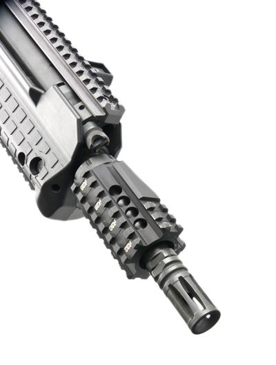 The RFB Quad Rail is made from hard coat anodized 6061-T6 aluminum and is approximately three inches long and will accept any accessories which mount with a standard MIL-STD 1913 Picatinny Rail attachment. The two scalloped cut-outs on the top of the Picatinny allow the shooter freedom to adjust the gas system if needed and allow the ejected casings to leave the ejection port. The shooter should take caution on which accessories to mount on the left hand side of the weapon since this could block the ejection port.