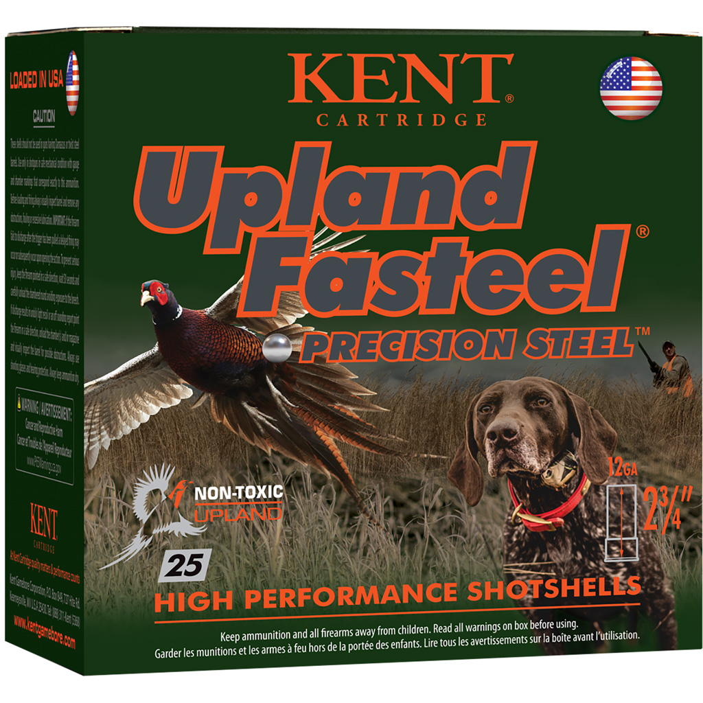 Kent's Upland shotshells outperform whether hunting the open plains of the United States, in Europe or Britain, whether the birds are pheasant, chukkar, bobwhites, grouse or woodcock. Upland hunting is a demanding and challenging experience, but with hard hitting Upland Fasteel, a day in the field means a bird in the hand. Upland Fasteel is available for small birds and pheasant shooting in both 12 and 20 gauge.