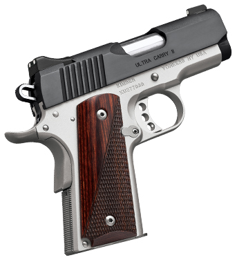 The Ultra Carry II (Two-Tone) is a hallmark of Kimber quality complete with a brushed-polished carbon slide aluminum frame and smooth/checkered rosewood grips. - Specifications - Height (inches) 90� to barrel: 4.75 - Weight (ounces) with empty magazine: 25 - Length (inches): 6.8 - Magazine capacity: 8 - Recoil spring (pounds): 16.0 - Full-length guide rod - Frame - Material: Aluminum - Finish: Satin silver - Width (inches): 1.28 - Slide - Material: Steel - Finish: Matte black brush-polished - Barrel - Length (inches): 3 - Material: Stainless steel match grade - Twist rate (left hand): 16 - Ramped - Sights - Fixed low profile - Radius (inches): 4.8 - Grips - Smooth/checkered rosewood - Trigger - Aluminum three hole standard - Factory setting (approximate pounds): 4.0-5.0