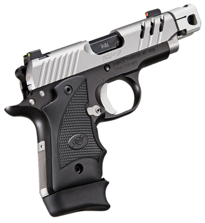 MICRO 9 ESV TWO TONE(MC)(TP) features a mini-compensator which reduces muzzle rise and perceived recoil. The ESV slide is topped with Truglo Tritium Pro night sights and wears Hogue black rubber wraparound grips. - Specifications - Height (inches) 4.07 - Weight (ounces) with empty magazine: 19.2 - Length (inches): 7.09 - Width (inches): 1.08 - Magazine capacity: 7 - Recoil spring (pounds): 11.5 - Frame - Material: Aluminum - Finish: KimPro II BLACK - Slide - Material: Stainless steel ESV slide - Finish: Glass Bead - Barrel - Length (inches): 3.45 - Material: Stainless steel match grade - Twist rate (left hand): 16 - Sights - Truglo Tritium Pro Night Sights - orange front sight ring u-notch rear sight with cocking ledge and chartreuse sight rings - Grips - Hogue Black Rubber Wraparound grips - Trigger - Premium aluminum - Factory setting (approximate pounds): 7.0