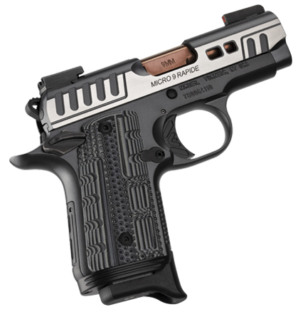 The MICRO 9 RAPIDE (DUSK) features performance enhancing features such as stepped cocking serrations slide lightening cuts for faster lock time striking two-tone KimPro finish and Rose Copper (TiCN) coated barrel for extreme durability flush fitting magwell along with Stiplex front strap pattern for positive grip. - Specifications - Height (inches) 4.07 - Weight (ounces) with empty magazine: 15.6 - Length (inches): 6.1 - Width (inches): 1.08 - Magazine capacity: 7 - Recoil spring (pounds): 11.5 - Frame - Material: Aluminum - Finish: Kimpro II Gray - Slide - Material: Stainless steel - Finish: Brushed Stainless Sides and Black KimPro II - Barrel - Length (inches): 3.15 - Material: Stainless steel match grade - Twist rate (left hand): 16 - Coated in Rose Copper Titanium Carbo-Nitride (TiCN) - Sights - Tru-Glo TFX Pro Day Night Sights. - Grips - Black/Gray G10 grips - Trigger - Premium aluminum - Factory setting (approximate pounds): 7.0