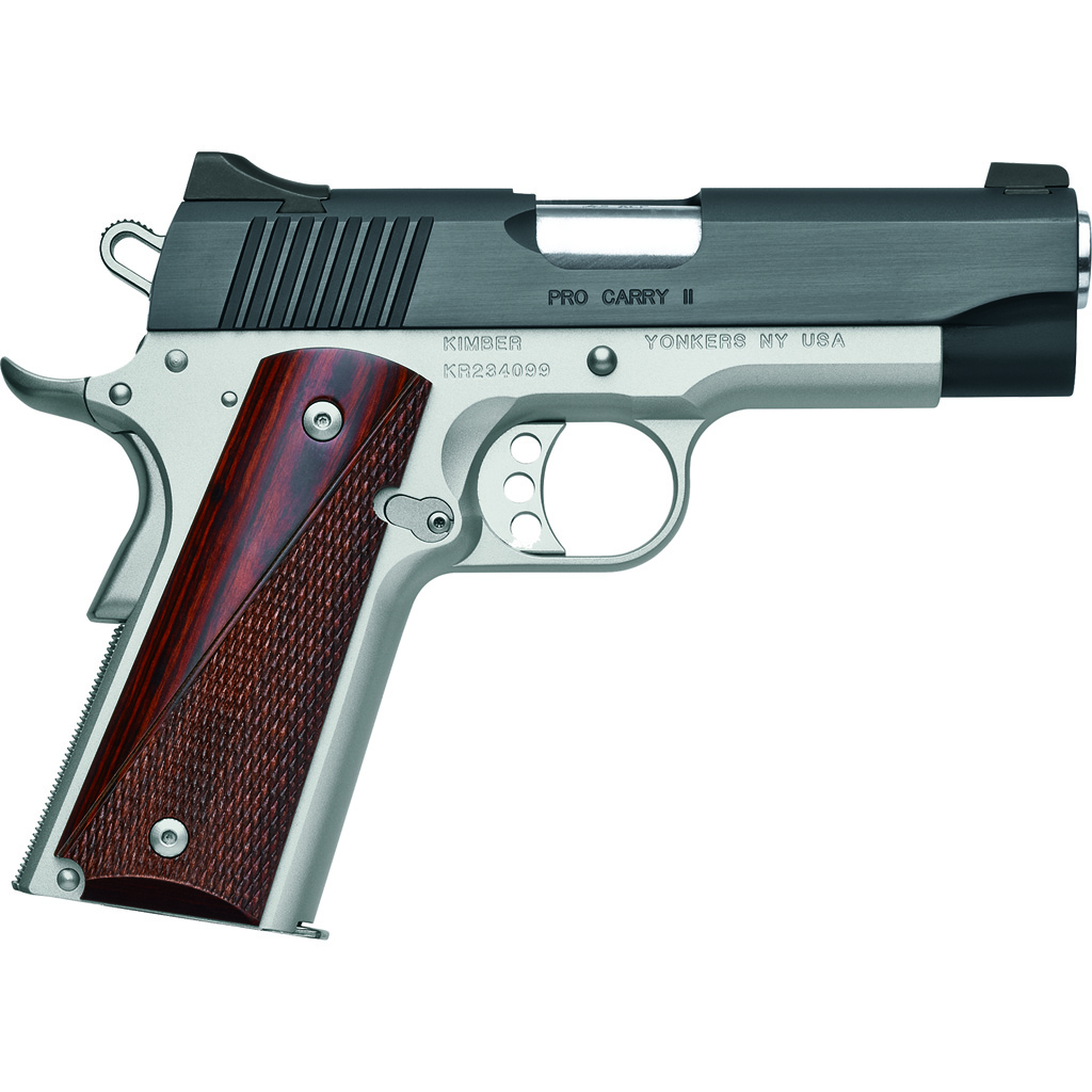 The Pro Carry II is a hallmark of Kimber quality, complete with a brush-polished carbon slide, aluminum frame and smooth/checkered rosewood grips.