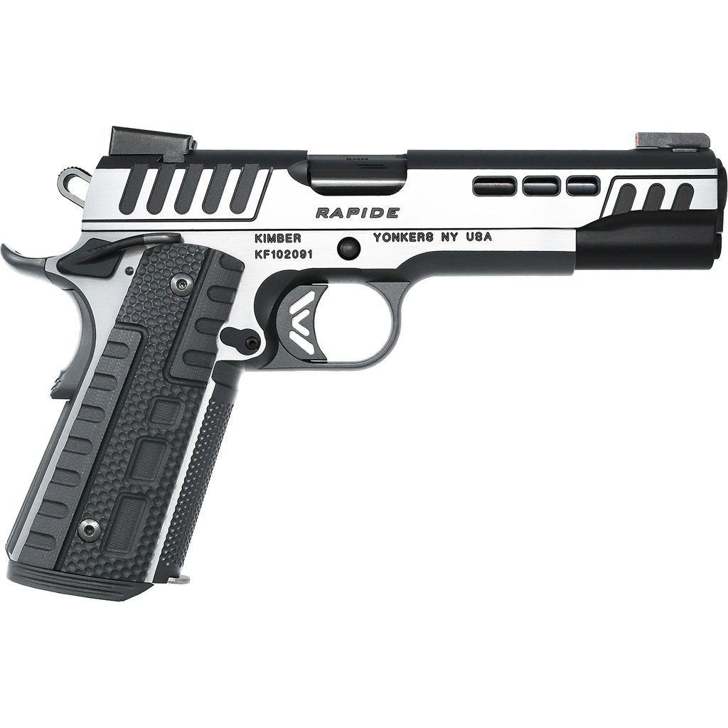 Kimber Rapide Scorpius 1911 in 9mm with a 5.25 in. black DLC barrel. Black KimPro II Stainless Steel slide with brush polished flats and black contoured G10 grips. TruGlow TFX Pro day Night sights and an 9 round magazine included.