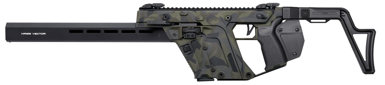 Tailored for recreational use and competition in pistol caliber carbine divisions the KRISS Vector Gen 3 CRB is the most accessible model with a 16 rifle length barrel and is compliant in most states. The upper and lower housings have been reimagined and enhanced for adaptability. The CRB comes equipped with a refreshed barrel shroud with M-LOK� mounting points. - The CRB is fed with full size Glock� magazines ensuring seamless interchangeability for users familiar with Glock-style mags. - REDESIGNED HOUSINGS - INTERCHANGEABLE PISTOL GRIP SYSTEM - AMBIDEXTROUS ADJUSTABLE FOLDING STOCK - M-LOK BARREL SHROUD - AMBI MAG RELEASE & REDESIGNED CONTROLS - Skeletonized Trigger with 0.7mm Pre-Travel - Ambidextrous Short Throw Safety Lever - Gen 3 Bolt Release and Mounting Block - Full Length MIL-STD 1913 Picatinny Top Rail - Short Charging Handle / Brass Check Function - 4-Pin Tool-Less Disassembly - Caliber 45ACP - Model Vector CRB - Action Semi-Automatic - Operating System Closed Bolt Delayed Blowback - Barrel Length 16.0 in / 406.4 mm - Overall Length Collapsed 34.9 in / 887.5 mm - Overall Length Extended 36.9 in / 937.5 mm - Magazine(s) included (1) 10 Rounds - Color Woodland Delta CERAKOTE� Coating - Weight 7.7 lbs / 3.5 kg - Barrel Material 4140 Chrome Moly - Barrel Finish Black Nitride (QPQ) - Barrel Threading .578x28 RH - Trigger Type Pivoting Single Stage - Stock KRISS Ambidextrous Telescopic Folding Stock - What's in the Box - (1) KRISS Vector Firearm - (1) Magazine - (1) Cleaning Kit - (1) Cable Lock - (1) User Manual - (1) Warranty Card