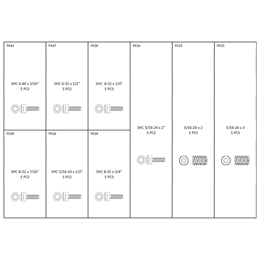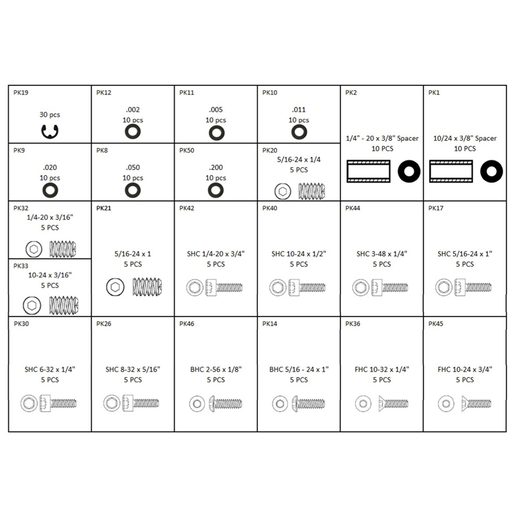 The PRO parts kit is a 3 box set loaded with a variety of screws, bolts, stabilizer studs, washers, cam spacers, e-clips, bolt spacers and much more in large assortment of sizes. It’s the perfect kit that will supply the lost part you can never seem to find. Each box is equipped with a guide that will tell you the exact size and name of each part that's inside the kit. Kit includes a thread gauge, basic parts kit with 310 pieces, parts kit 2 with 85 pieces and parts kit 3 with 45 pieces for a total of 440 pieces.