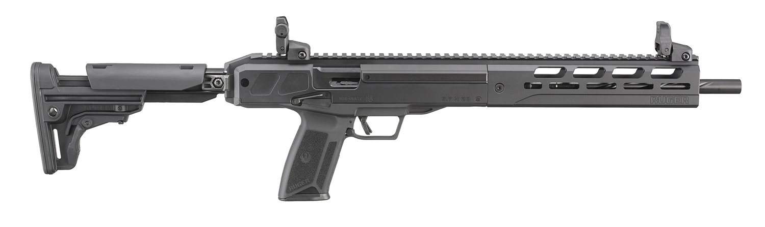 This state compliant model features a non-threaded barrel, fixed stock and 10-round magazine. Weighing under 6 lbs., the lightweight and compact Ruger LC Carbine utilizes the same steel magazines and familiar ergonomic controls as the Ruger-5.7 pistol. Unique bolt-over-barrel design with the magazine in the grip allows for excellent balance and pointability. Features a 16.25'' fluted, nitride-treated steel barrel for strength, accuracy, and longevity. Impressive ergonomics with ambidextrous manual safety, reversible charging handle, ergonomic bolt release and extended magazine release latch. Utilizes Ruger's safe, reliable and proven Secure Action fire-control system that combines a protected internal hammer with a bladed-safety trigger. The trigger has a short, smooth pull, clean break and positive reset. CNC-milled handguard that is Type III hard-coat anodized aluminum for maximum durability, with M-LOK accessory attachment slots. Multiple QD sling sockets allow for maximum versatility. Ruger Rapid Deploy folding sights are adjustable for windage and elevation and the full length Picatinny rail allows for optic mounting. Safety features include: 1911-style ambidextrous manual safety; an integrated trigger safety; lightweight firing pin; neutrally balanced sear with significant engagement and strong spring tension; and hammer catch to help prevent the hammer from contacting the firing pin unless the trigger is pulled. Also includes: one Ruger-5.7 steel pistol magazine, ambidextrous magazine button, M-LOK QD sling socket and hex wrenches for disassembly.